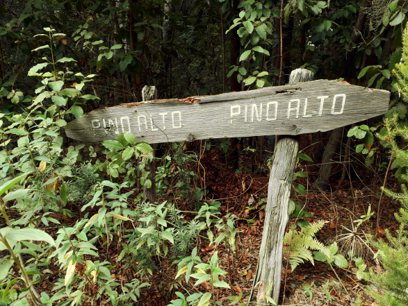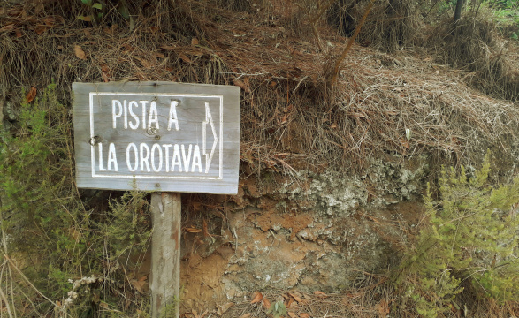 Nun folgt man zunächst der Pista a La Orotava die gleich einen Rechtsbogen macht. Kurz danach sieht man im Gebüsch ein altes Holzschild mit der Aufschrift „Pino Alto“. Hier nimmt man den nach rechts abzweigenden Weg, der leicht bergab führt. Nun beginnt ein sehr bequemes Stück Weg. In mehreren Kurven geht es langsam bergab. Nach genau 1km eine scharfe Rechtskurve, nach 500m eine scharfe Linkskurve und nach weiteren 500m wieder eine scharfe Rechtskurve.