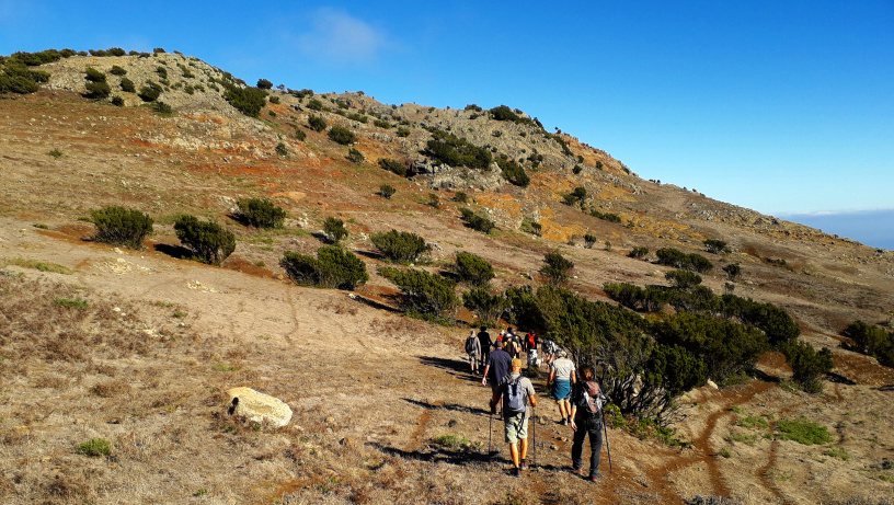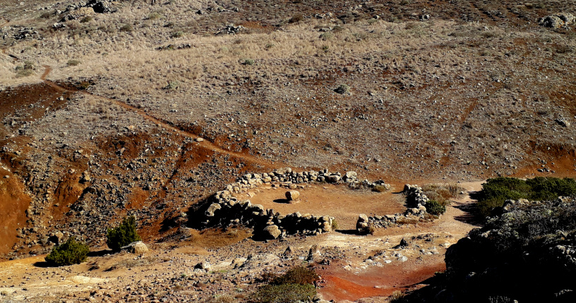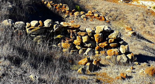 Nach einem weiteren tollen Aussichtspunkt geht man nun in einem Linksbogen in ein weites Tal hinunter. Hier sind uralte Ackerterrassen, teilweise mit Mauern eingefasst. Ziel ist der weithin sichtbare „gelbe Fleck“. Dort überquert man ohne Weg den trockenen Bachlauf und steigt oberhalb des gelben Flecks ebenfalls weglos bis zur Anhöhe hinauf. Gegenüber sind Höhlen in den Fels geschlagen, die von Ziegenhirten als Schutz genutzt werden.