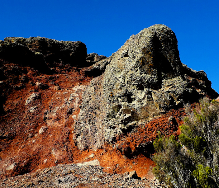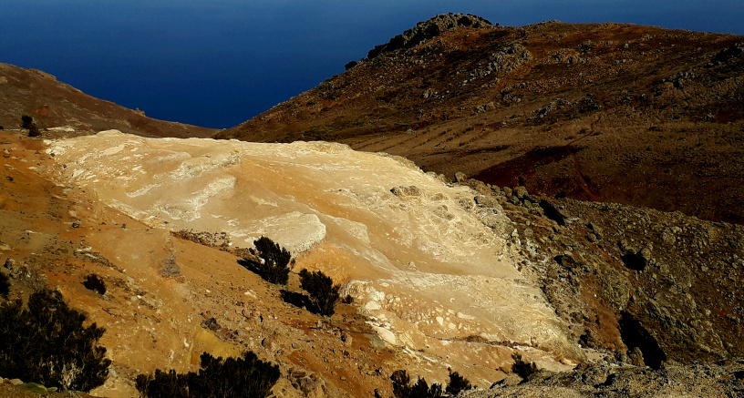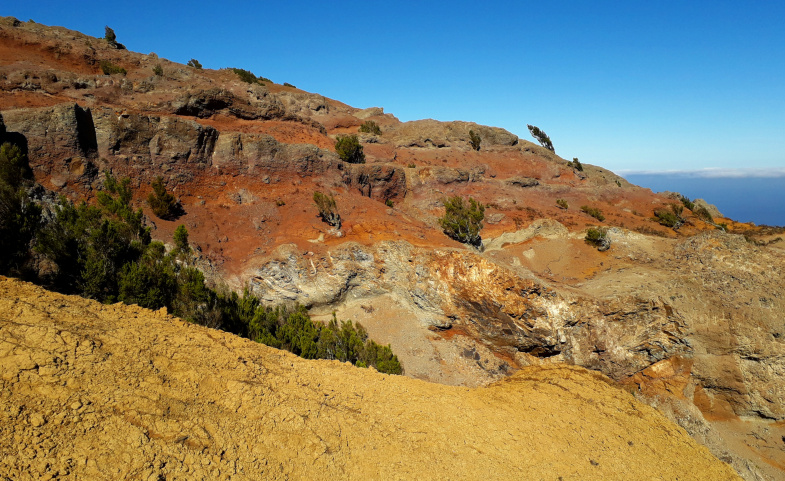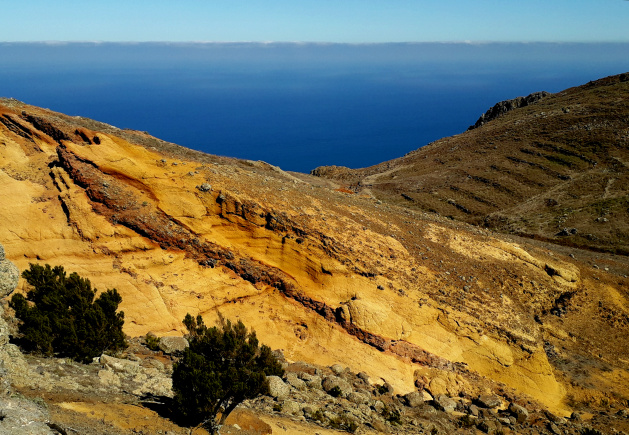 Rot – braun – gelb – weiß. Wer glaubt, dass Vulkangestein immer schwarz ist, sollte sich mal aufmachen zu den Hochflächen des Teno. Dort ist die Natur so bunt wie nirgends sonst auf der Insel. Überraschend farbig sind die Gesteine, tiefblau das Meer und der Himmel, und ein wenig grün gibt es auch.