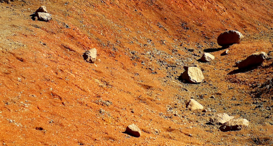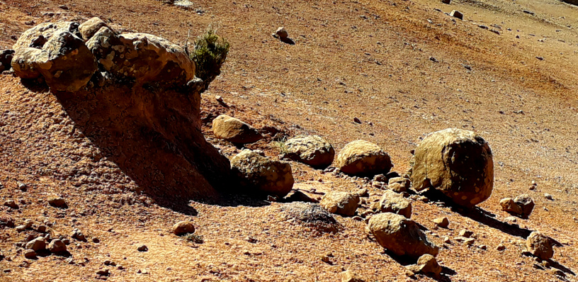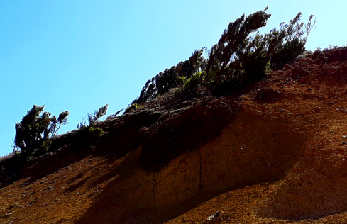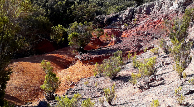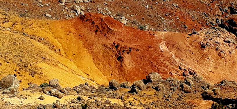 Der Weiterweg steigt nun sanft an. Nach 200m sieht man von einer Anhöhe aus schon das Gebiet der roten Erde. Hier sind Tuffe mit besonders schönen Farbtöne aufgeschlossen