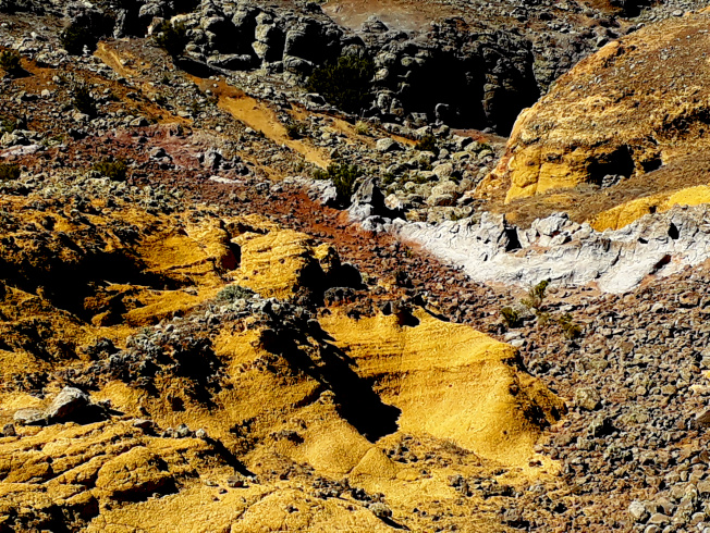 Hinzu kommen Schichten aus weißen oder sehr hellen vulkanischen Tuffen, wie sie bei einer pyroklastischen Vulkanexplosion entstehen können, die an der Oberfläche oft sehr glatt sind.