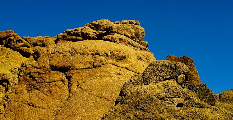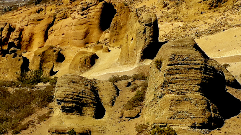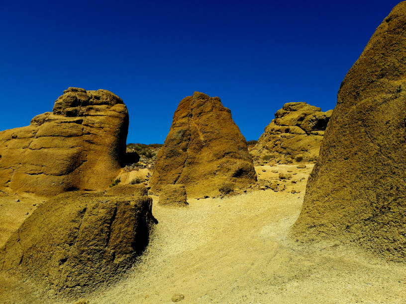 Nicht auslassen sollte man noch die bizarren Felsgruppen direkt an der asfaltierten Straße, etwa 200m unterhalb der Kurve. Hier sind besonders schöne gelbbraune Felsen aus Tuffgestein herauspräpariert.