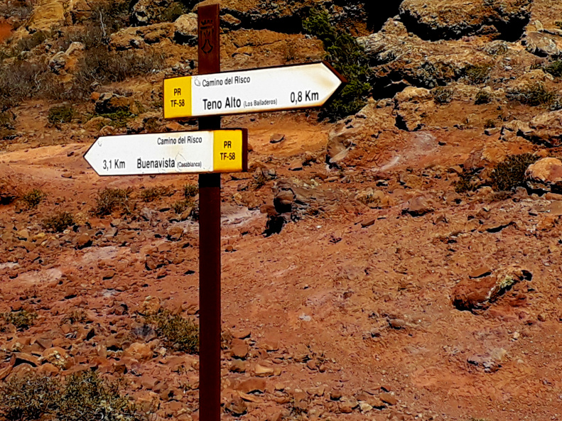 An der unten bei „Anfahrt“ beschriebenen Parkmöglichkeit geht man links durch niedriges Gebüsch auf einem teilweise undeutlichen Pfad am Hang entlang, der nach etwa 100m beginnt, langsam anzusteigen. Nach rechts hat man schöne Ausblicke in den Barranco, hinunter nach Buenavista und zum Teide.