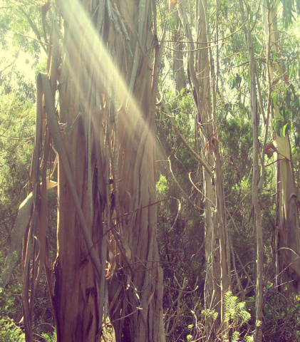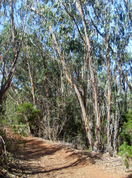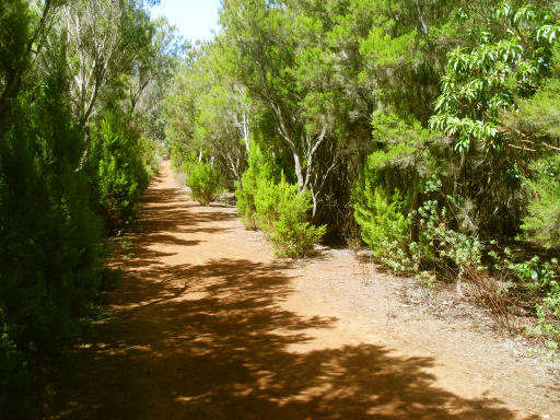 Links der Straße wurde ein Parkplatz angelegt. Genau dort geht man hinein und gleich rechts, wo ein mit einer Kette versperrter Weg parallel zur Straße durch einen Baumheidewald führt. Der Weg macht eine Linkskurve, geht leicht bergauf, und man kommt durch den Eukalyptuswald. Man bleibt immer auf dem Hauptweg und lässt Abzweigungen nach rechts unbeachtet.