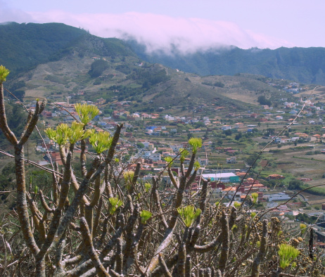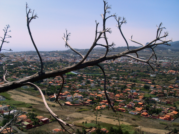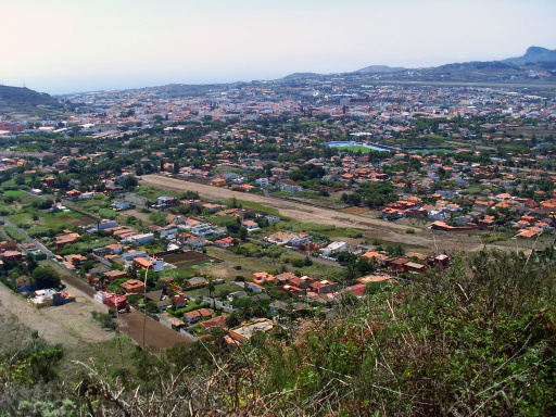Nach links hat man einen schönen Blick hinunter ins Tal von Tegueste. Von hier aus sieht man sehr deutlich die Mesa de Tejina und den Höhenrücken La Orilla. Das sind andere schöne Aussichtsberge, zu denen eine Wanderung hier beschrieben ist: Tisch mit Aussicht (II).