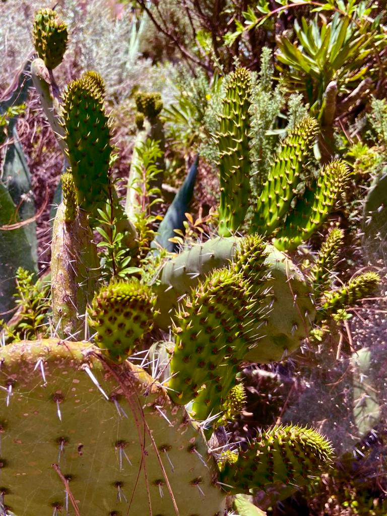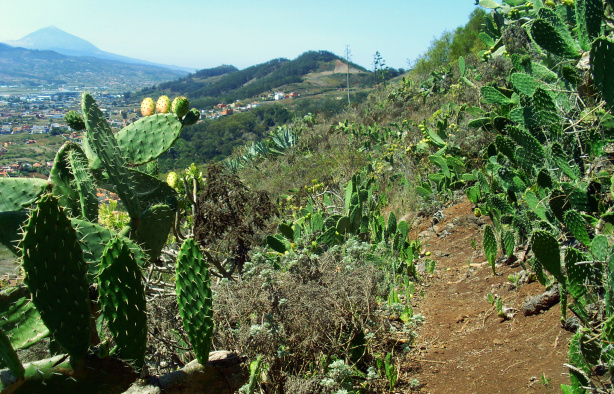 Für den Weiterweg, Teil 2, geht man zurück zum Punkt (B). Etwa 5m hinter der Schranke muss man einen verwachsenen Pfad suchen, der sogleich steil abwärts durchs Gebüsch geht. Ein paar Meter weiter unten entdeckt man dann den Wanderpfad, der nun hangparallel verläuft. Es gibt immer wieder steile Abschnitte, bei denen große Vorsicht angesagt ist. Ein Stolpern könnte einen unangenehmen Sturz in die Kakteen zur Folge haben. Die fantastische Aussicht über La Laguna genießt man am besten nur im Stehen. Der Weg führt unterhalb des Denkmals in stetem Auf und Ab langsam um den Berg herum, bis man zu einer markanten Felsnase kommt. Dort sieht man unterhalb schon die Straße.