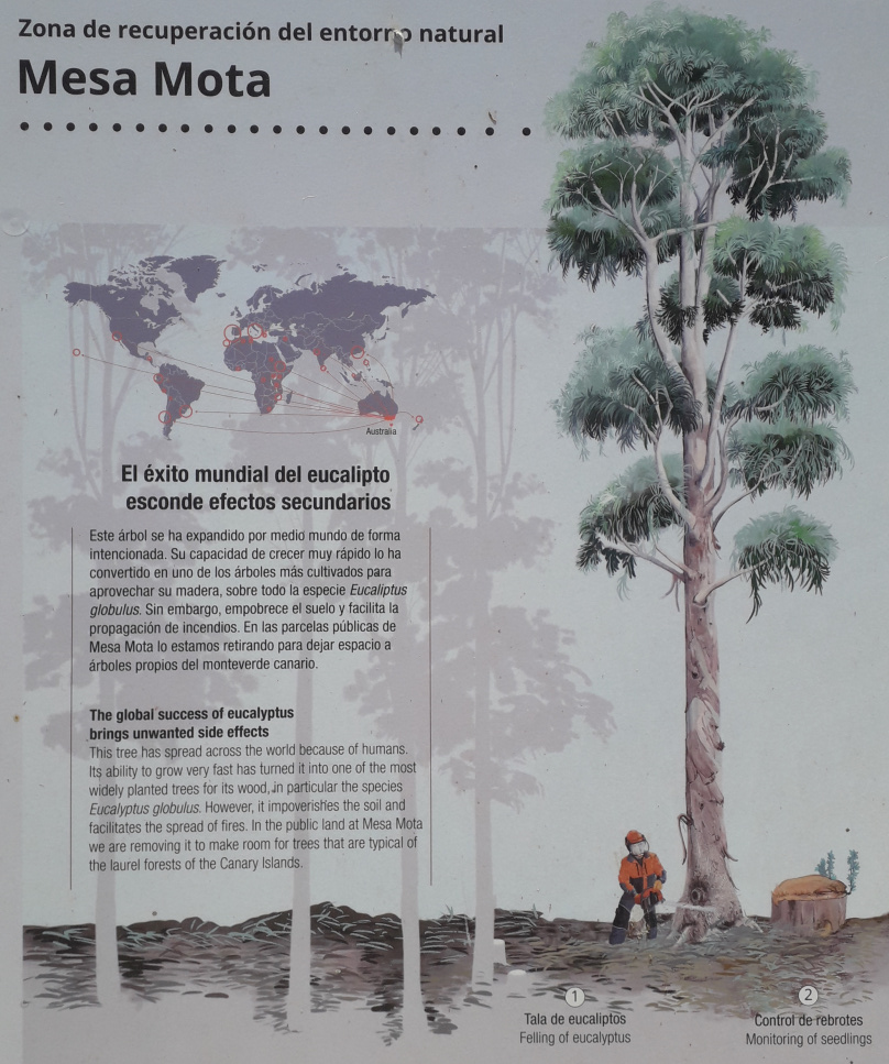 Der Eukalyptus hat sich weltweit ausgebreitet. Seine Fähigkeit, sehr schnell zu wachsen, hat ihn zu einem der am meisten der am meisten angebauten Bäume zur Holznutzung gemacht, insbesondere die Art Eucalyptus globulus. Im Tal von La Laguna wurde er auch angepflanzt, um das Sumpfgebiet trocken zu legen, denn er zieht viel Wasser aus dem Boden. Er verarmt jedoch den Boden und begünstigt die Ausbreitung von Bränden. Auf den öffentlichen Grundstücken von Mesa Mota werden die Eukalyptusbäume entfernt und durch die typischen Bäume des kanarischen Monteverde ersetzt.