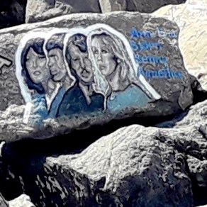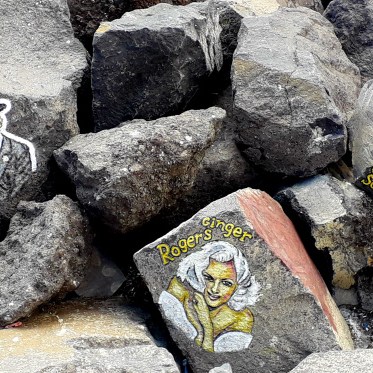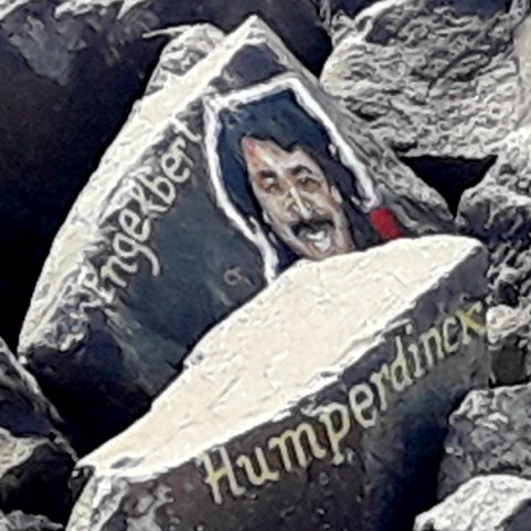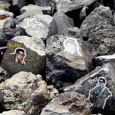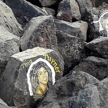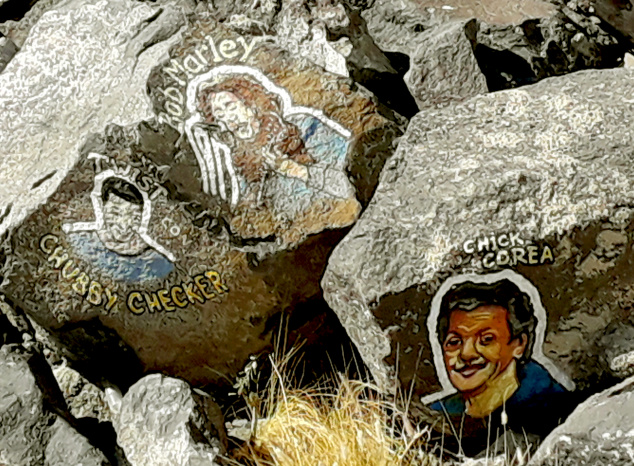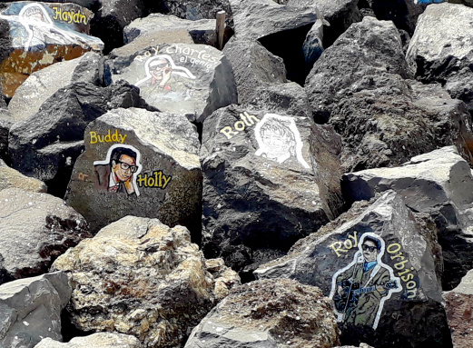 Um die meisten der Gesichter malte er noch einige Zentimeter breit einen weißen Hintergrund, damit sie sich besser von den schwarzen Felsen abheben. Einige Musiker sind in der Zwischenzeit schon etwas verblasst, und anderen hängt eine Strähne aus Seetang ins Gesicht. So wurden sie an anderer Stelle noch einmal gemalt und es sind nun insgesamt mehr als hundert, aber sie alle zu zählen, ist schwierig.