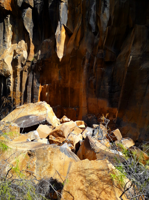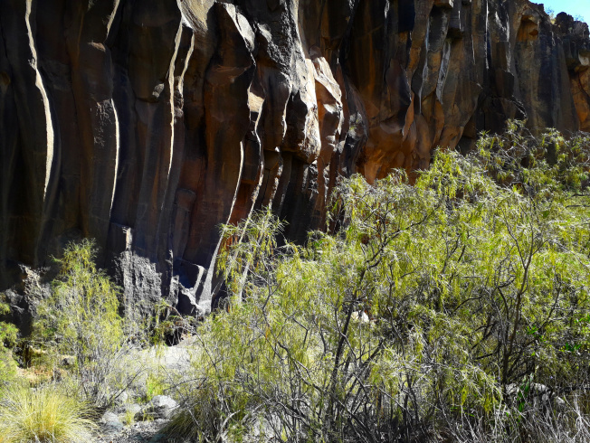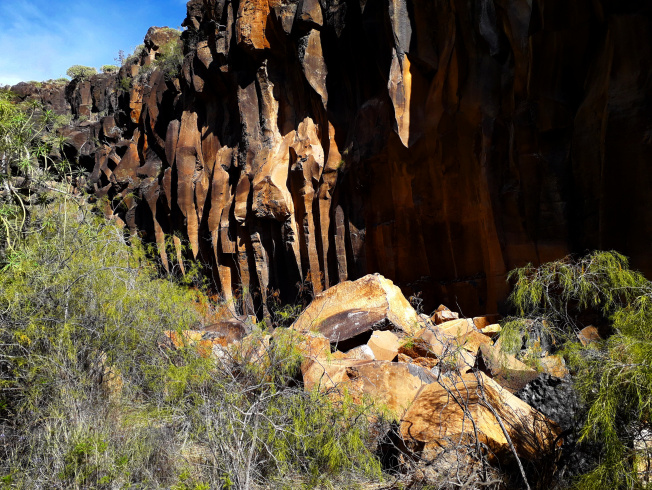 Auch danach geht man einfach weiter im Bachbett, mal felsig, mal sandig. Rechts und links erheben sich senkrechte Felswände aus Basalt. Hier fällt die säulenförmige Anordnung der Basaltergüsse auf. Durch die Hitze der Gesteinsschmelze in der Tiefe und gleichzeitiger langsamer Abkühlung an der Oberfläche entstehen vertikale Konvektionszellen, die nach der Verfestigung als hexagonale Säulen erscheinen. Durch Spannungs- und Dehnungskräfte bilden sich Spalten, bis schließlich nach langer Zeit die Blöcke auseinanderbrechen.