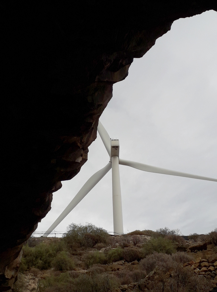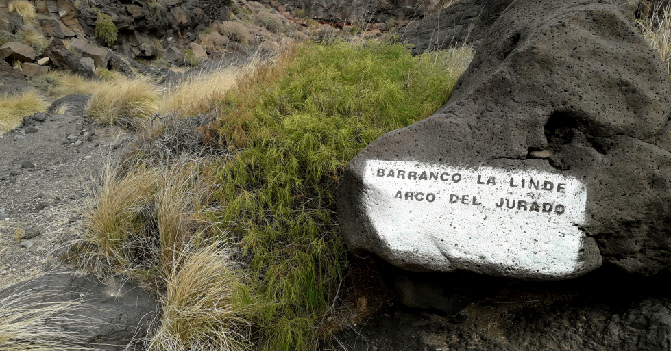 Rechts oberhalb liegt die gewaltige Naturbrücke „Arco de La Linde“, aber man kann sie leider von unten nicht sehen. Deshalb geht man zurück und beim Wegweiser aus dem Tal heraus auf die Anhöhe. Weiter oben bei einer Piste hält man sich links durch verlassene Ackerterrassen in Richtung auf das große Windrad und steht alsbald ziemlich unvermittelt vor dem Felsbogen.