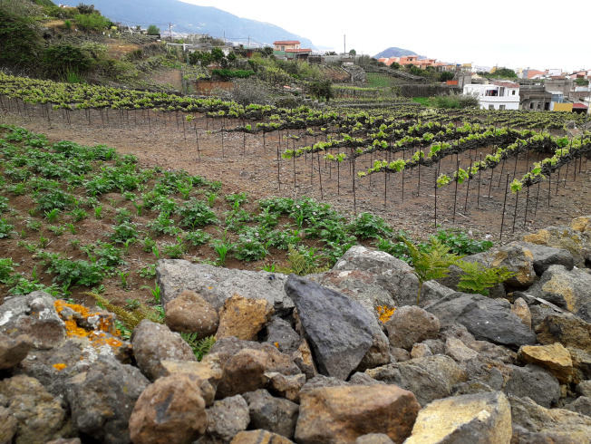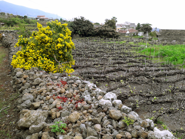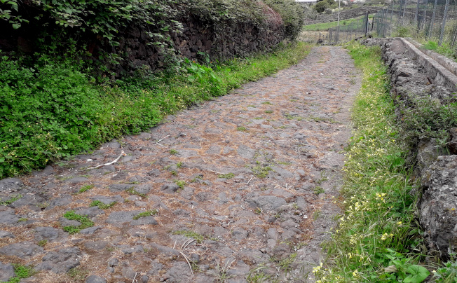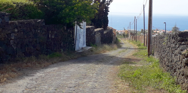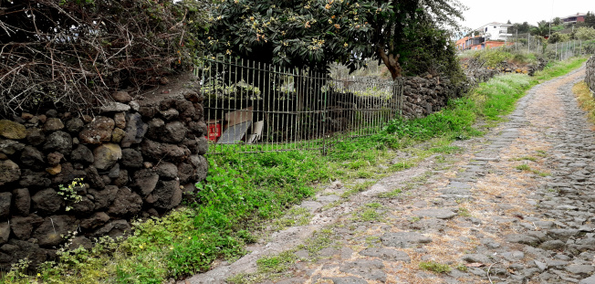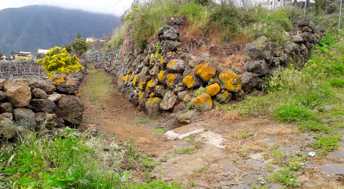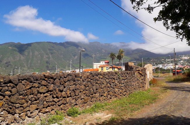 Zwischen uralten Natursteinmauern kommt man durch Ackerterrassen mit Wein- und Kartoffelanbau, und der eine oder andere Abstecher nach links oder rechts bietet schöne Ausblicke auf die Stadt. Nach rund 750m und 110m höher endet der Weg an der Hauptstraße TF-21. Direkt gegenüber setzt sich der historische Weg als Camino La Candelaria fort und trifft in der Kurve von Barroso, kurz vor der Abzweigung nach Pinolere, wieder auf die TF-21. Ein altes Pflaster gibt es dort nicht mehr zu sehen, aber dieser Abschnitt hat seine Besonderheit als Pilgerweg bei der Wallfahrt nach Candelaria.