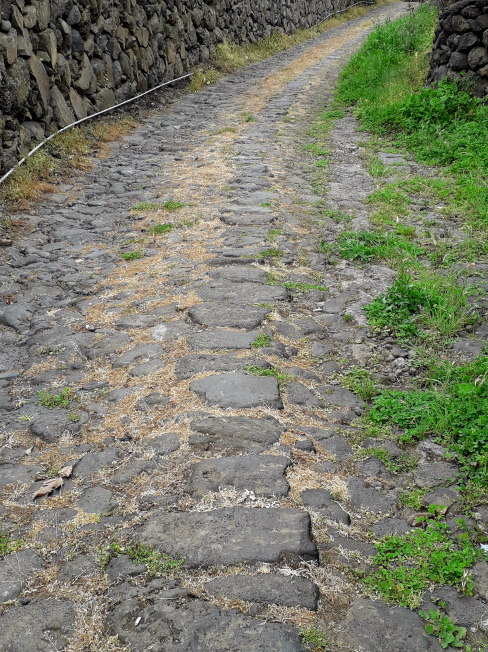 Über einen Höhenunterschied von mehr als 300 Metern brauchte man eine befestigte Verbindung, die mit Fuhrwerken sicher zu befahren war, denn man musste auch Weinfässer sicher transportieren können. Die Straßenpflasterung aus behauenen Basaltsteinen entsprach der damals modernsten Technik. Sie besteht aus kleinen Steinreihen, die diagonal von einer Mittelachse aus größeren Steinen angeordnet sind, so dass es wie ein Fischgrätenmuster aussieht. Beim Bau der Straße wurde auch ein solider Unterbau aus verdichtetem Ton angelegt, ein Grund, weshalb das Pflaster bis heute so gut erhalten ist.
