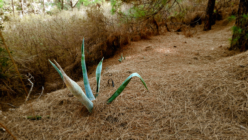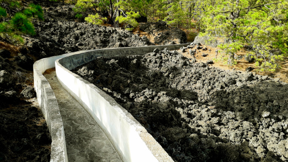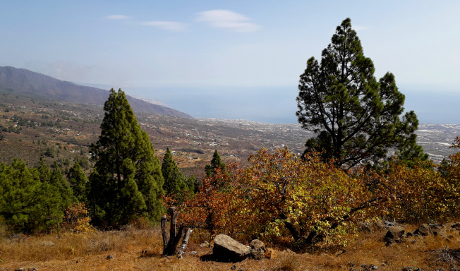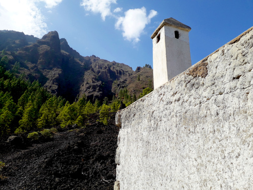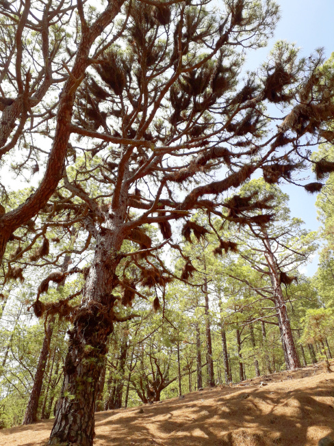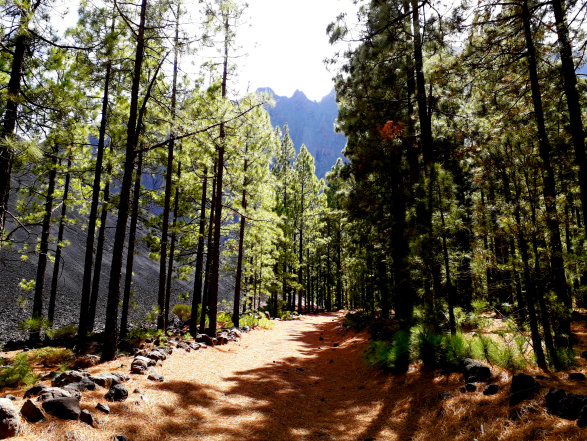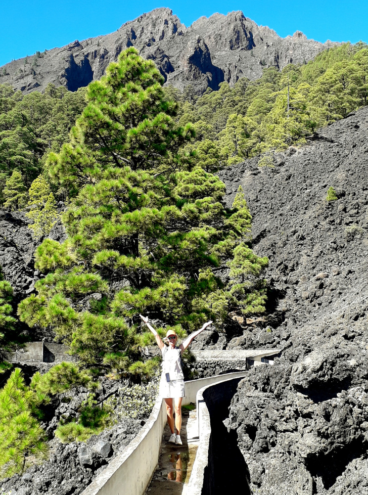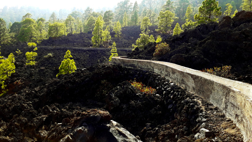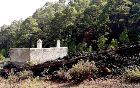 Der Kanal, dem man folgt, bringt Wasser aus verschiedenen Galerías. An einigen offenen Becken kann man sich erfrischen oder die Trinkflaschen füllen, hier fließt sicher ganz frisches Trinkwasser. Zum Glück kommt man bald in den Wald, wo der Weg nicht mehr ganz so steil ist, und vor allem etwas schattiger. Zwischen gewaltigen kanarischen Kiefern geht es im Zick-zack weiter durch den Monte Verde. Dieses Waldstück wurde beim Vulkanausbruch von den Lavaströmen verschont.