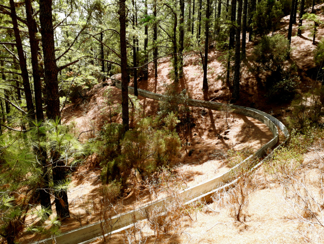 Der Kanal windet sich danach wieder durch den Wald. Nach 1,4km trifft man auf die Stelle, wo man am Anfang heraufgekommen ist. Jetzt ist leider noch einmal ein steiler Abstieg erforderlich, durch den Wald und längs der Wasserleitung, die man schon vom Aufstieg her kennt. Es ist noch einmal ratsam, hier vorsichtig zu gehen. Rutschige Kiefernnadeln oder weg rollende Steine sind gerade dann gefährlich, wenn die Kraft in den Beinen nachlässt.