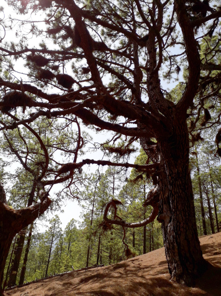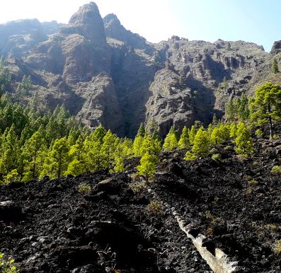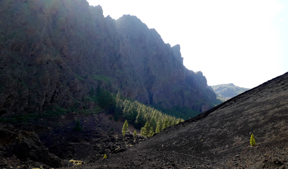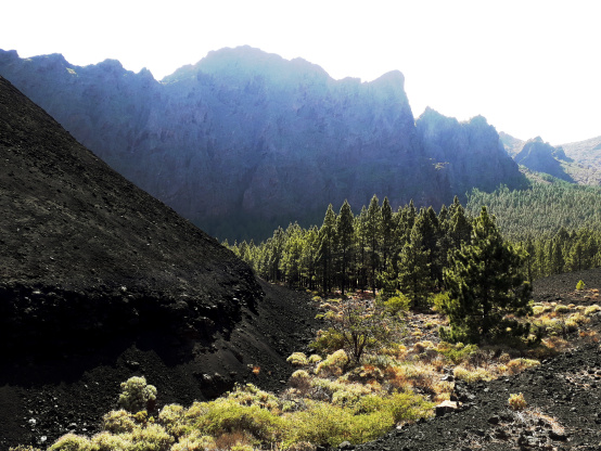 Dieser Wald wächst hier in der Caldera de Pedro Gil auf rund 1500m Höhe. Eigentlich ist dies ein uralter Vulkankrater, der an der Ostseite aufgebrochen ist. Rundherum steigen die beeindruckenden Felswände des ehemaligen Kraters steil auf. Mitten in diesem Krater ist dann der Vulkan von Arafo ausgebrochen. Diesen kann man nun näher in Augenschein nehmen.