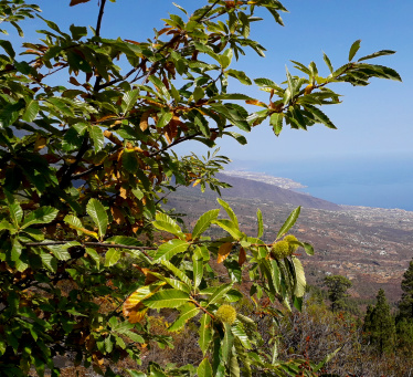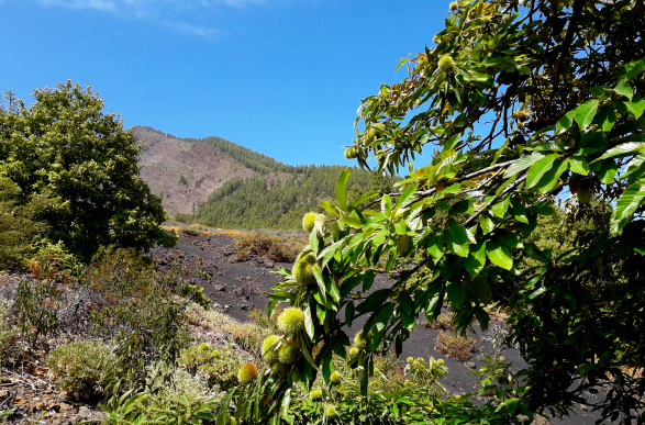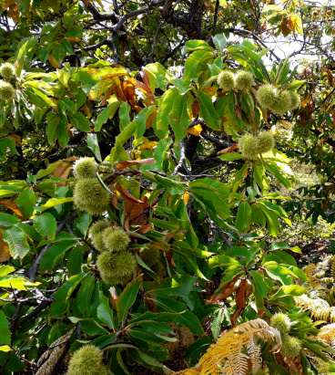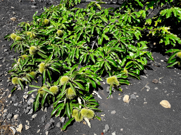 Nach den Kanal geht es dann weiter, immer noch steil, durch den Wald bergauf, der Weg ist nicht markiert, aber auch nicht zu verfehlen. Nach einem weiteren Kilometer und 200m höher kommt man am Waldrand zu einer alten Schutzhütte. Kurz davor hat sich die Vegetation überraschend geändert. Hier oben trifft man plötzlich auf Kastanienbäume. Sie haben ihre Wuchsform an das unwirtliche Klima hier oben angepasst und sind zu Krüppelbäumen verkümmert. Ihre Äste kriechen nah am Boden entlang, und das frische Grün der Blätter und vor allem der stachligen Kastanien bildet einen starken Kontrast zu den schwarzen Schuttflächen.