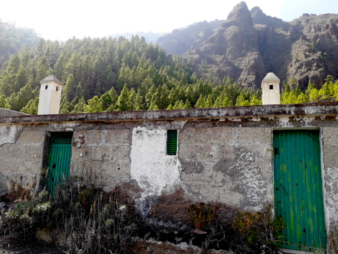 Auf der Piste nach rechts kommt man dann durch den größten Lavastrom des Vulkans. Es wirkt wie ein Wunder, dass in diesem Felsenchaos wieder Bäume Fuß gefasst haben. Nach einer Schranke geht die Piste leicht bergab, bis man in einem Tal und wieder im Wald, zu einem verlassenen Gebäude kommt, ein altes Forsthaus.