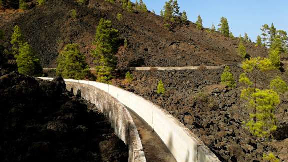 Dies ist nun ein sehr erholsamer Abschnitt der Wanderung. Man geht immer im Kanal entlang, der bald aus dem Wald heraus führt und den Lavastrom in vielen Kurven durchquert. Welch enorme Leistung der Wasserbauingenieure, die vor rund hundert Jahren diesen Kanal mit fast unmerklichem Gefälle angelegt haben! Immer wieder muss man auch stehen bleiben und die herrliche Aussicht bewundern, hinunter ins Tal von Güímar und bis nach Santa Cruz. Bei guter Sicht taucht am Horizont die Nachbarinsel Gran Canaria auf.