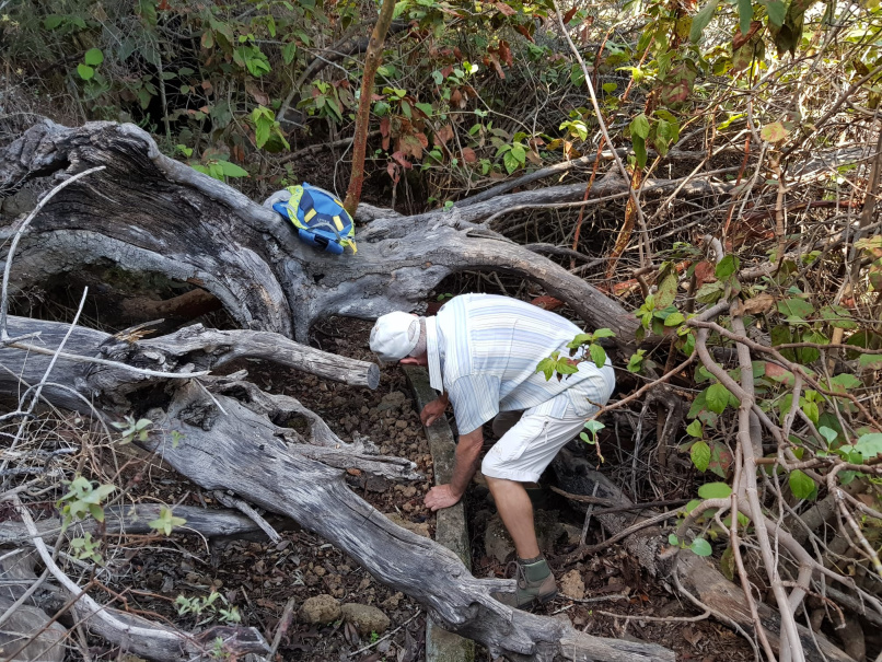 Hier könnte man nach rechts einen Abstecher auf dem Canal der Arafo machen, der gleich danach in eine Schlucht hinein führt. Nachdem man viel Gebüsch und einige umgestürzte Bäume überwunden hat, verschwindet der Kanal im Tunnel. Taschenlampe und eine gute Kopfbedeckung sind ab hier Pflicht!