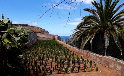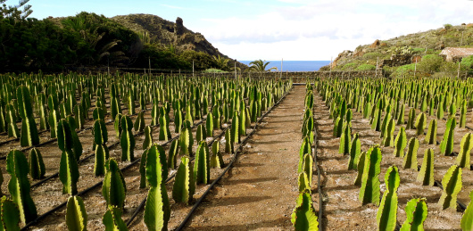 Für mitteleuropäische Ziergärten oder Parks ist sie eine exotische Pflanze. Hier auf der Finca La Punta ist ihre Kinderstube, hier wächst sie in Reih und Glied, akribisch mit Wasserleitungen versorgt, bis sie groß genug für den Export ist. Aber auch wer Kakteen sucht, wird im Garten die unglaubliche Vielfalt endecken.