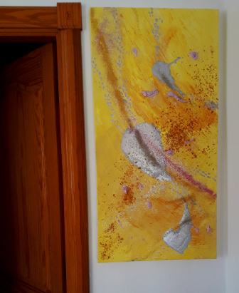 Malen ist eine weitere Leidenschaft von Edith. Vielleicht sollte man besser sagen: Kunstwerke entwerfen, denn bei ihren Bildern verwendet sie nicht nur Farbe. Sie kombiniert verschiedene natürliche Materialien und lässt sich von ihnen inspirieren. Es glitzert und blinkt auf ihren Bildern und jedes ist einzigartig. Die meisten sind hell und strahlen Freude aus, in blau, in gelb, in rot, und immer mit viel weiß.