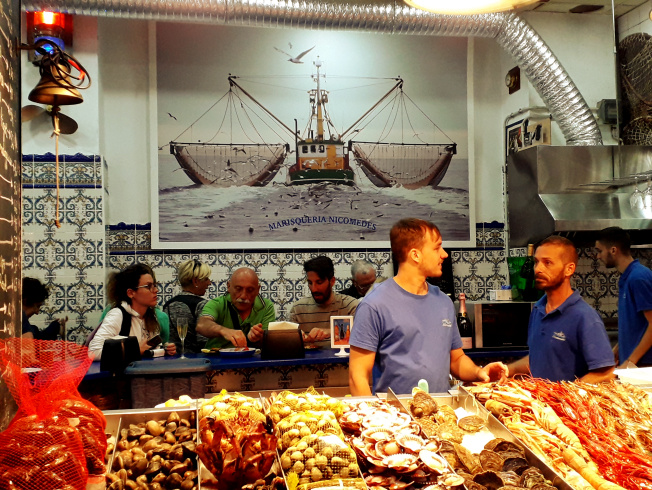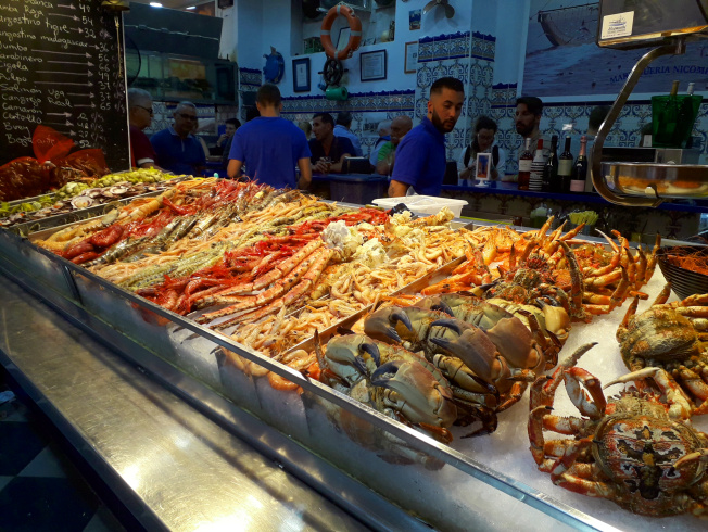 Was sie alles mitbringen, gibt es ein Stockwerk tiefer. Liebhaber von Fisch und Meerestieren sollten unbedingt dort unten auf Entdeckungsreise gehen. Mehr als 30 Verkaufsstellen bieten hier eine unglaubliche Vielfalt an – einfach alles, was aus dem Wasser kommt.
