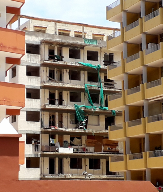 Es steht direkt an einer der touristisch viel frequentierten Straßen im Zentrum, der Avenida Familia Betancourt y Molina, zwischen Hotels und Apartmentblocks, nicht weit vom Strand und der Promenade. Sanieren oder Abreißen? Das sind die beiden Alternativen für das marode Hochhaus, aber selbst nach Jahrzehnten kommt der Dialog zwischen den verantwortlichen Parteien nicht voran. 1965, als das Hochhaus erbaut, wurde hieß die Straße noch Avenida del Generalisimo. Im Jahr 1991 musste das Haus zwangsweise geräumt werden, weil gravierende statische Mängel festgestellt wurden.