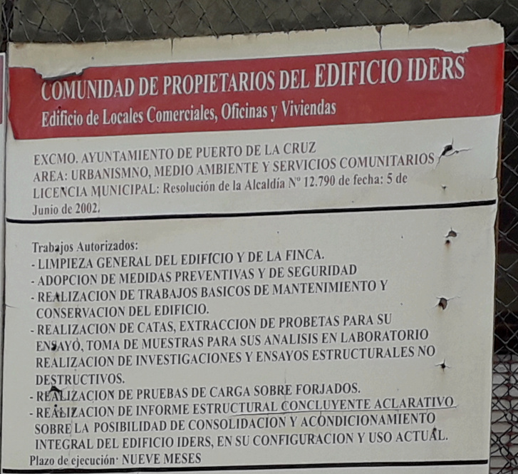 10 Stockwerke, 84 Wohnungen, 14 Lokale und Verkaufsräume, 1841 Quadratmeter, 40 Eigentümer. Das Iders-Gebäude im Zentrum von Puerto de la Cruz legt seit 30 Jahren Zeugnis ab von schlampigen Bauarbeiten, fortschreitendem Zerfall, von widersprüchlichen Interessen und erschreckender Langsamkeit der städtischen Verwaltung. Wohnstätte von 150 illegalen Besetzern, Brutstätte von Kriminalität und Krankheiten, nicht nur ein Schandfleck, auch ein scheinbar unlösbares Problem. Ein ziemlich fest gezogener Knoten.