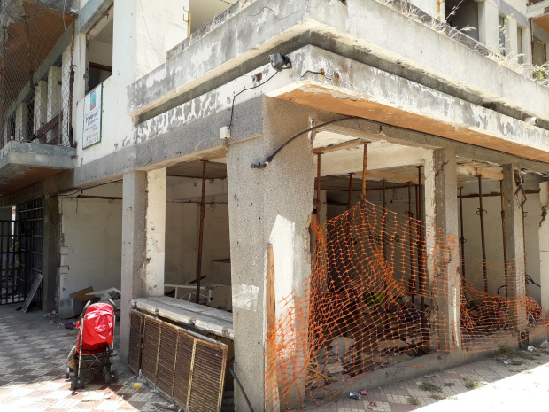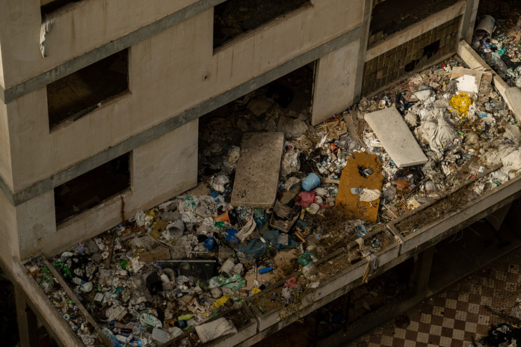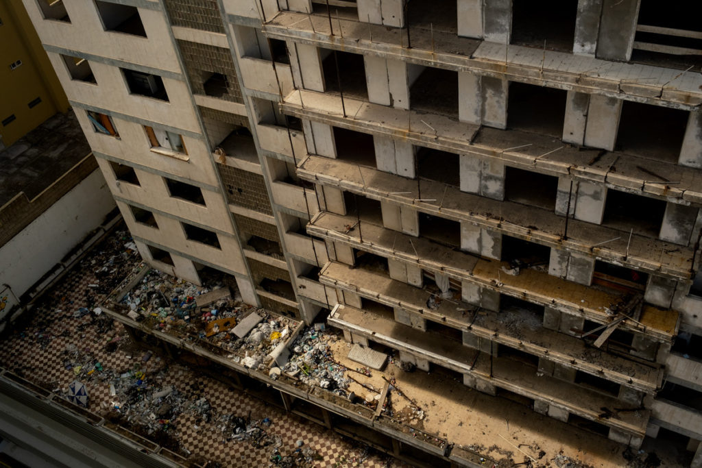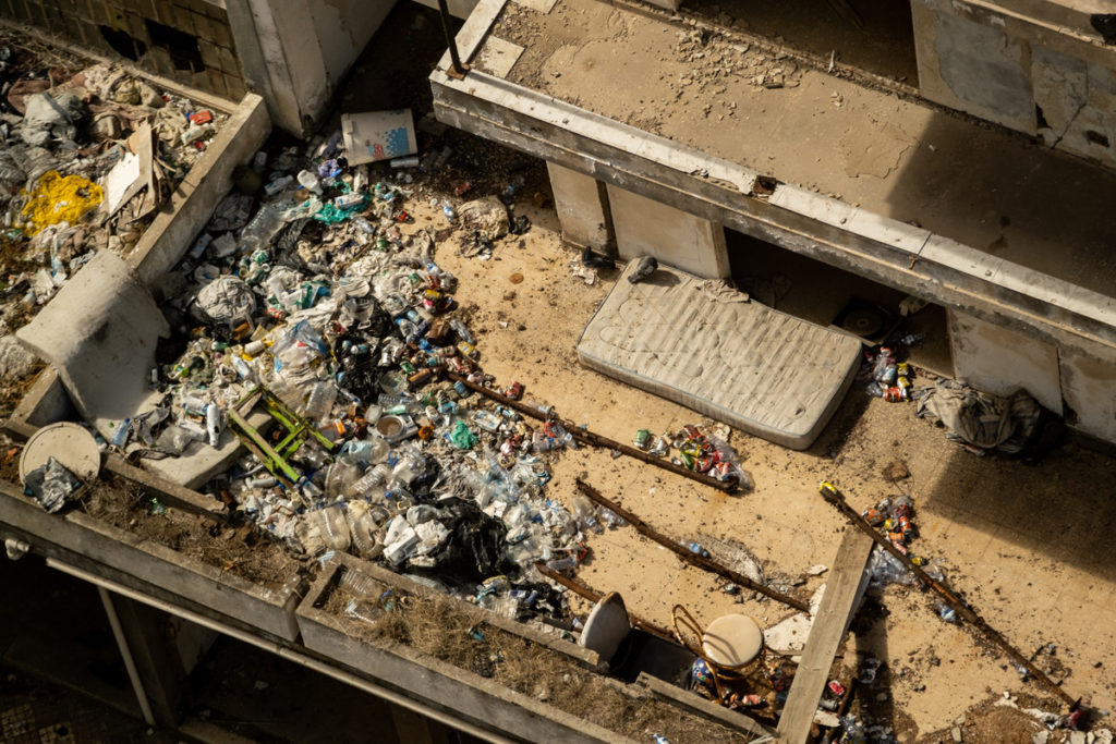Die Abfallentsorgung ist jedoch auch Monate später noch nicht ins Rollen gekommen, ganz zu schweigen von einem tatsächlichen Abbruch. Nach einem kräftigen Regen und viel Wind sind im Oktober 2024 Betonteile und eiserne Stützpfeiler heruntergefallen, letztere waren nur mit Holzkeilen gesichert, die im Laufe der Jahre verrottet sind. Einige dieser Stützen könnten aus großer Höhe auf die Straße fallen. „Wir sind keine Bau-Experten oder Techniker, aber wir sind auch nicht dumm, und das Gebäude kann jeden Moment zusammenbrechen, weil es immer mehr Risse bekommt“, sagt der Vorsitzender der Eigentümergemeinschaft des Nachbarhauses.