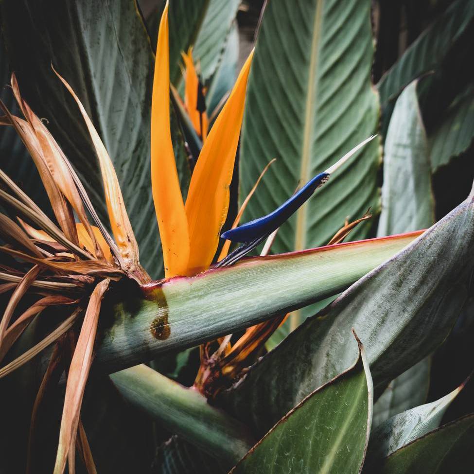 Wenn sich die exotische Blüte der Strelitzia fächerförmig öffnet, nimmt sie die Form eines tropischen Vogelkopfes an, mit einem harten braunen Schnabel und einem farbenfrohen orangefarbenen und tiefblauen Kamm. Sieht sie nicht wie ein echter Paradiesvogel aus? Tatsächlich ist dieser Name auf ihre enorme Ähnlichkeit mit einem gleichnamigen Vogel aus Neuguinea zurückzuführen. Am schönsten ist die Blüte, wenn sich alle drei orangenen Kelchblätter und die drei blauen Kronblätter geöffnet haben, dann beginnen sie nach einigen Tagen zu verwelken.