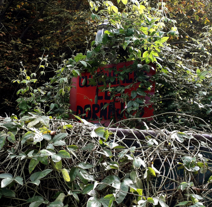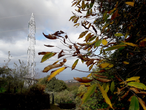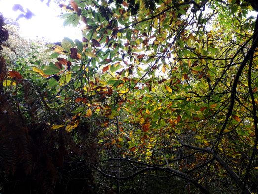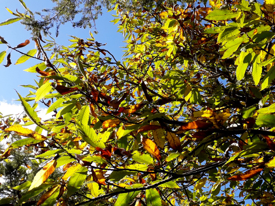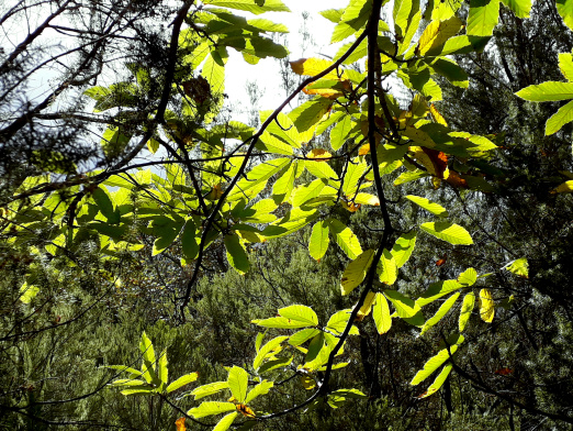 Eine weitere Abzweigung darf man nicht verpassen. Dort geht es 90º nach links entlang einer alten Mauer weiter. Hier ist der Weg auch wieder weiß-gelb markiert. Noch einmal geht es durch dichten Dschungel, man könnte fast sagen, ein Urwaldtraum! Weiter unten werden die Kastanienbäume wieder häufiger. Herrlich, wie die Kastanienblätter in der Sonne leuchten! Man kommt schließlich an einer Betonpiste heraus, dort biegt man spitzwinklig links ab und kommt bald zu einer Informationstafel zum Thema Kastanien.
