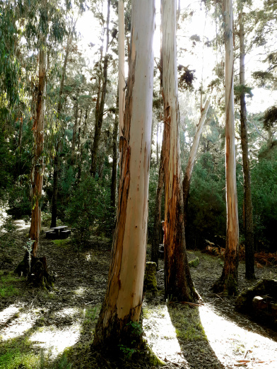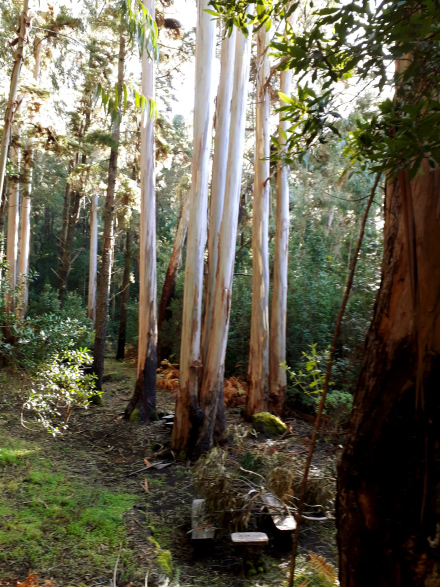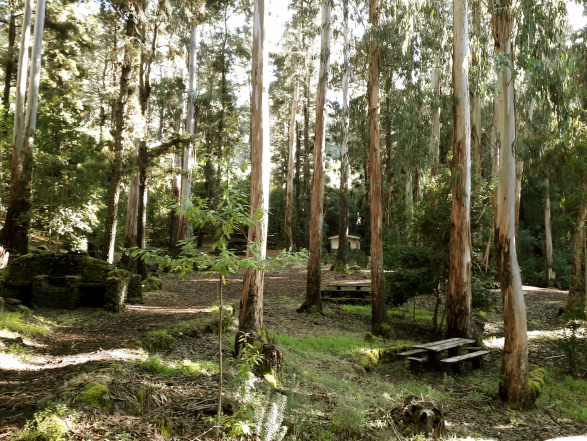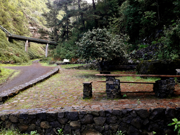 Hoya del Abade ist eine Vertiefung unterhalb der Piste. Dort gibt es Tische und Bänke, Wasserstellen und Grillplätze. Wer jetzt Pause machen will, kann dort hinunter gehen, muss aber zur Fortsetzung der Wanderung wieder herauf. Der Picknickplatz ist etwas wild und vernachlässigt, aber die Szenerie ist beeindruckend. Man sitzt unter riesigen Eukalyptusbäumen und genießt den unvergleichlichen Duft.