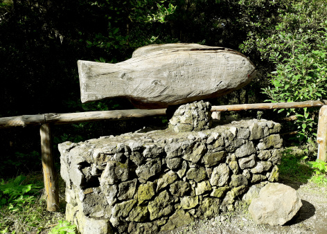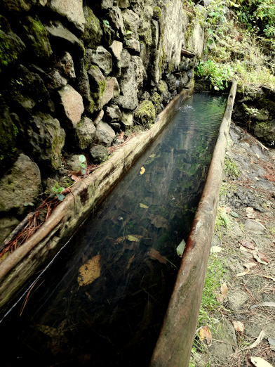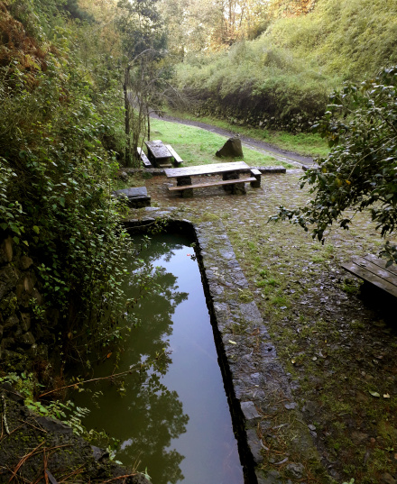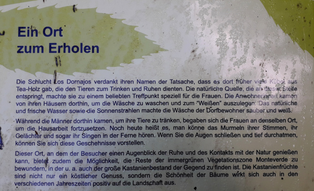 Dann geht man den Weg weiter ins Tal hinein. 300m weiter kommt man zu ein paar alten Picknicktischen und einer Informationstafel, dahinter fällt eine riesige Kanalbrücke auf. Auf der Tafel wird erklärt, welche Bedeutung dieser Ort in früheren Zeiten hatte. Das Wort dornajo bedeutet Tränke oder Trog. Ein langer Holztrog, ein großes gemauertes Wasserbecken und ein steinerner Waschplatz sind noch vorhanden. Auch hier am Brunnen gibt es frisches Wasser.