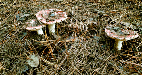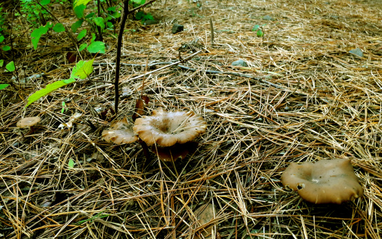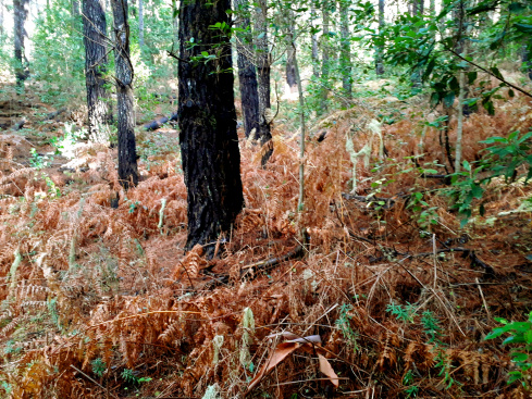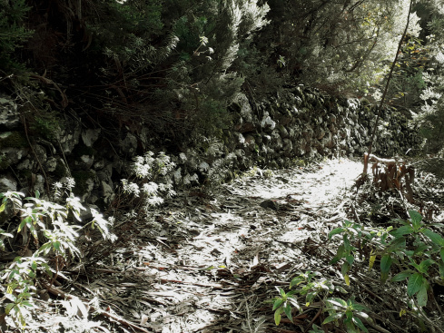 Direkt bei der Informationstafel steigt ein schmaler Pfad rechts den Berg hinauf, der sogleich in den dichten Wald hineinführt. Man duckt sich unter Brombeerranken und schiebt Äste von Kastanienbäumen zur Seite. Es kann feucht und glitschig sein, denn an diesem Nordhang dringt selten ein Sonnenstrahl bis zum Boden. Nach den ersten kräftigen Regenfällen im Herbst wird man hier im Wald eine Vielzahl von Pilzen entdecken. Wer weiß, ob sie genießbar sind?