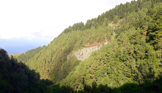 Nach einer Rechtskurve geht es bergab. Blickt man nach links oder rechts, sieht man viele ehemalige Terrassen, ein Zeichen dafür, dass diese Zone früher einmal intensiver landwirtschaftlich genutzt wurde. Unterhalb einer Fincamauer kann man ca. 30m nach links gehen und kommt zu einem kleinen Aussichtspunkt über den Barranco Los Dornajos.