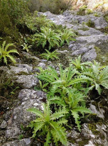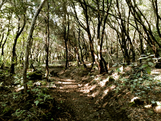Der markierte Weg führt wieder zum Picknickplatz Hoya del Abade. Kurz vorher knickt er links ab, geradeaus abwärts signalisiert ein X, dass es dort falsch wäre. Aber genau da führt unser Abstieg jetzt hinunter. (Wer vom Picknickplatz kommt, muss diese Stelle suchen!). Der Weg ist schmal, ziemlich zugewachsen, kann aber nicht verfehlt werden. Es geht nun relativ steil abwärts, gelegentlich muss man sich an Ästen festhalten und bei glitschigen Steinen vorsichtig gehen. Der Weg verflacht sich dann etwas und wird etwas breiter, geht aber bei einer Kette wieder in der Urwald hinein und wird wieder steiler.
