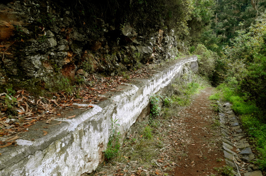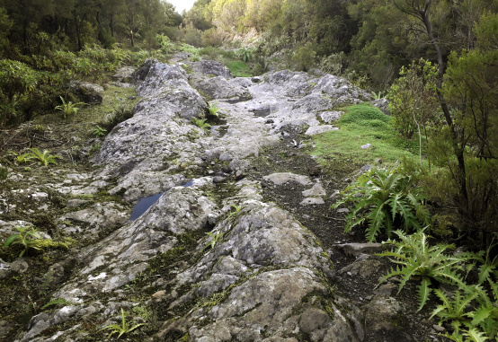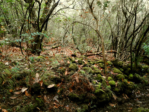 Auf diesem schönen Waldweg kommt wieder etwas Dschungel-Feeling auf. Ein Fahrweg bleibt unbeachtet, man geht weiter der weiß-gelben Markierung nach und durchquert ein Bachbett mit Felsen, das zum Barranco del Rincón gehört.