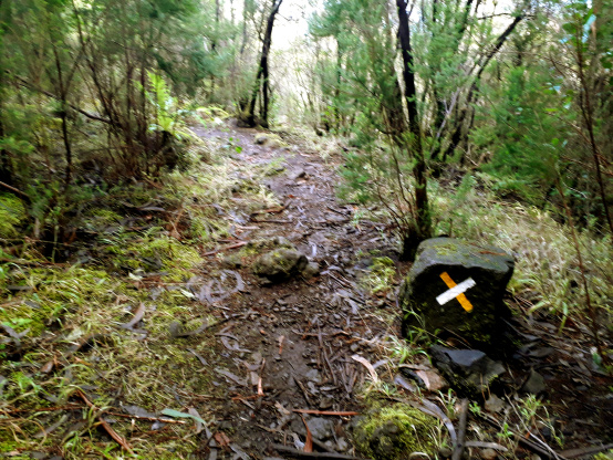Hier gibt es auch die Möglichkeit, die Wanderung etwas abzukürzen, indem man am unteren Ende des Picknickplatzes der weiß-gelben Markierung folgt. Aber Achtung: Von diesem Weg muss man an einer mit X markierten Stelle wieder abzweigen, siehe folgende Beschreibung.