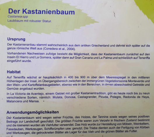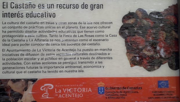Im November fallen sie herunter und es gibt kaum einen Einwohner von La Victoria, der dann nicht zum Kastaniensammeln geht. Was am Wegesrand liegt, darf man mitnehmen, aber da die Grundstücke in Privatbesitz sind, sollte man dort nicht Kastanien stehlen, denn die Bauern sind auf den Verkauf angewiesen. Es gibt einen grün markierten Rundweg SL-TF 30, die „Ruta de los Castaños“. Ab der Informationstafel hat man zwei Möglichkeiten: links der Tafel geradeaus weiter, oder rechts man auf einer Betonpiste hinunter. Bei der ersten Möglichkeit durchquert man gleich danach die ehemalige Finca Las Rosas, wo noch ein paar alte Gemäuer stehen.