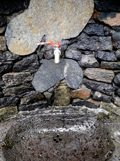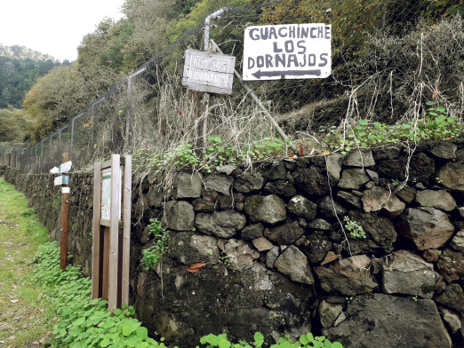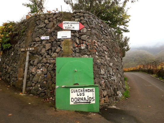 Kurz bevor der Asphalt endet, findet man einen Brunnen, an dem sich regelmäßig die Anwohner aus der Gegend mit frischem Quellwasser versorgen. Ein Blick Richtung Gebirge bestätigt: Von dort oben kommt sicherlich frisches Wasser. Ein Schild bestätigt, dass es sich um den Barranco Los Dornajos handelt, und ein zweites Schild bestätigt, dass weiter hinten noch einmal ein Guachinche liegt.