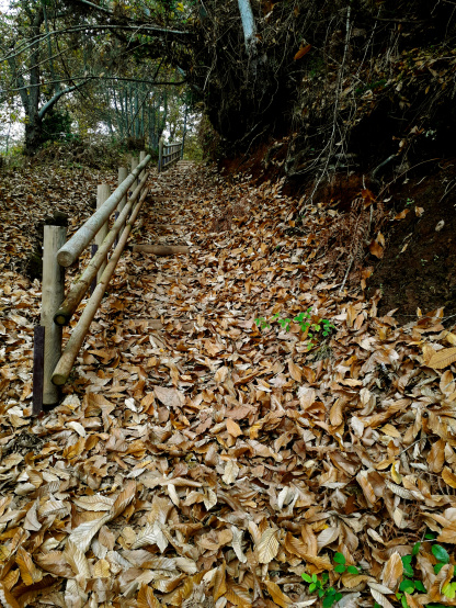 Danach geht es auf einem Treppenweg mit Holzbalken und Geländer steil abwärts. Vorsicht bei nassem Boden: Die Blätter und die herumliegenden Kastanien sind rutschig. Weiter unten überquert man einen Kanal. Wer mag, kann etwa 100m auf dem Kanal entlang gehen und kommt direkt zu der Stelle, wo die Rohre über die Kanalbrücke kommen. Gegenüber sieht man die Sammel- und Pumpstation. Der Weg kommt dann genau bei den Tränken wieder heraus, und man geht nach rechts bis zum Startpunkt.