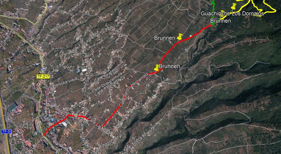 In La Victoria biegt man von der Carretera General TF-217 dort ab, wo Centro de Salud und Parque El Pinar ausgeschildert ist, in die Calle Añate. Oben rechts Calle Horno de la Teja, weiter Calle Laureles. Bei der Guardia Civil links in die Calle Pedro Hernandez, vorbei an dem Guachinche Antonio und der Casa Pepe. Weiter oben rechts und gleich nach einer Kurve, bei einem Brunnen, die Calle Potigaiga hinauf. Jetzt folgt man am besten der Beschilderung Guachinche La Finca und Guachinche Los Dornajos. Nach dem Guachinche La Finca geht die Straße leicht abwärts in den Barranco und man kommt zu dem Brunnen, wo man das Auto abstellen kann.
