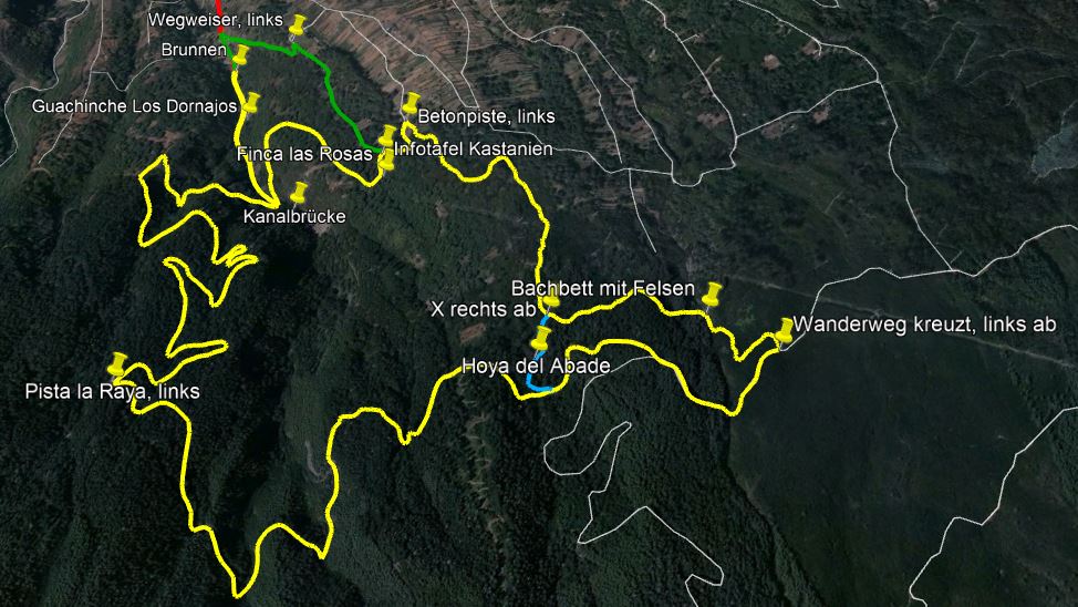 Karte: gelb=Wanderung, blau=Abkürzung Hoya del Abade, grün=Variante