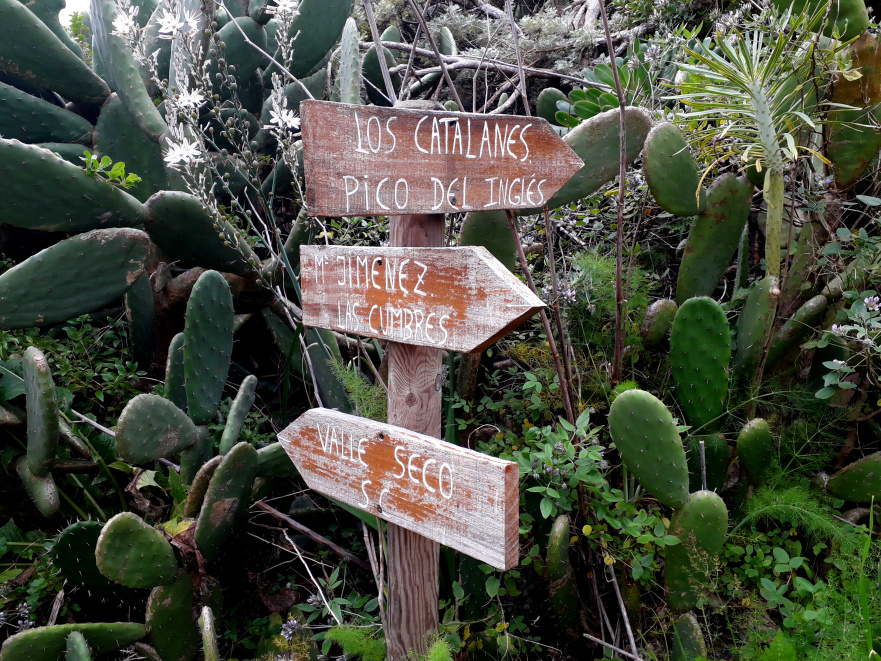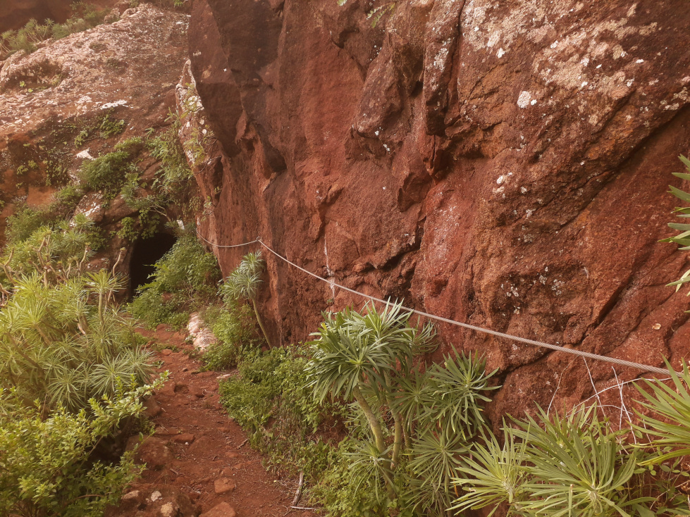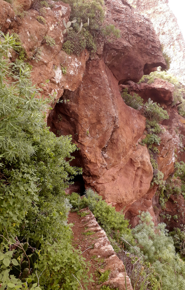 Direkt rechts neben der Kirche, auf 595m Meereshöhe, beginnt ein Wanderpfad, der zunächst leicht bergab auf dem Höhenrücken verläuft und dann ziemlich steil absteigt. Zum Meer und zu den Bergen hin bieten sich tolle Ausblicke. Unten angekommen, auf 450 m Meereshöhe, trifft man auf einen Querweg und hält sich links. Dort geht es gleich über ein Brücke, dann nach rechts, und 120m weiter kommt man an der Galería Roque Negro Los Catalanes vorbei.