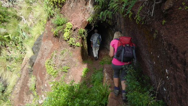 600 m nach der Brücke geht man durch den ersten von insgesamt fünf Tunneln. Die Tunnel sind alle kurz, eine Taschenlampe ist nicht nötig, aber man muss manchmal etwas gebückt gehen und auf den Kopf aufpassen.