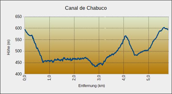 Höchster Punkt: 605 m, tiefster Punkt 435 m, aber mehrere Auf- und Abstiege