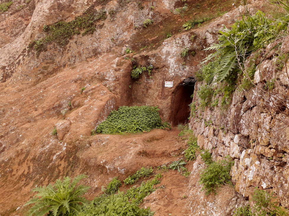 Aber zunächst geht man auf dem Kanal weiter. Es kommen noch zwei weitere Tunnel. Der letzte durchquert eine ziemlich auffällige, kahle Felswand. Es handelt sich um einen so genannten Gang oder eine Spaltenfüllung. Im ursprünglichen Gestein öffnete sich eine Spalte, in die neue Lavamassen eindrangen. Diese sind danach härter als das umgebende Gestein, das durch die Erosion im Laufe von zigtausend Jahren abgetragen wird. So bleibt die Spaltenfüllung letztlich als markanter Gesteinskörper stehen. Danach endet der Weg überraschend. Der Kanal geht hinter einem ziemlich zugewachsenen Stollen durch den Berg. Hier gibt es kein Weiterkommen.