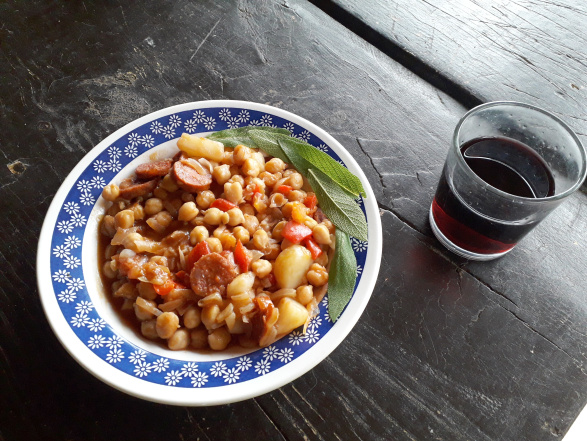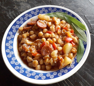 Zwiebel, Paprika und Knoblauch in grobe Stücke schneiden und in Öl glasig dünsten. Kichererbsen aus dem Glas mit der Flüssigkeit zugeben. Chorizo enthäuten, in Rädchen schneiden und zugeben, ebenso die Lorbeerblätter und die klein geschnittene Tomate. Alles langsam köcheln lassen. Zum Schluss noch die Kartoffeln bzw. Yucca bzw. Bubango und den Rotwein zugeben. Ca. 20 Minuten köcheln, bis die Flüssigkeit etwas eingedickt ist. Es soll nicht zu „suppig“ sein. Mit Salz und Pfeffer würzen. Auf dem Teller mit Petersilie, Schnittlauch, Salbei, oder was auch immer servieren.