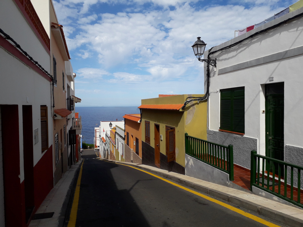 Auf dem zweiten Weg (Karte, gelb) sieht man weniger Bananen, kommt aber hinunter zum Strand des Dorfes. 20m links der Bar beginnt ein Treppenweg, den man zwischen Häusern hinunter steigt. Unten an der Straße geht es links und gleich danach noch einmal über ein paar Treppen in die Calle Hermanos Ponte Mendez. Zwischen Reihenhäusern kommt man zum Ende der Straße, wo ein Treppenweg hinunter führt zur Playa de la Consolación.