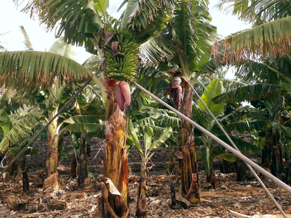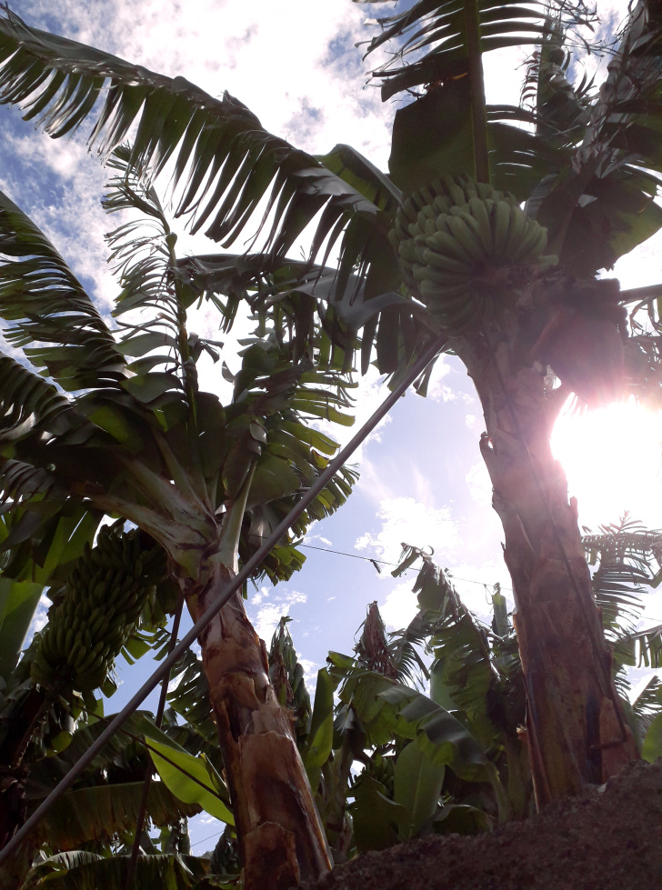Schon gewusst? Die Banane ist die einzige Pflanze ist, die laufen kann. Neben fast jeder Staude beobachtet man ein „Kind“, einen neuen Trieb. Jede Pflanze trägt nur einmal, nach der Ernte wird sie abgeschlagen und der neue Trieb wächst heran, der dann nach 130-180 Tagen wieder Früchte liefert. Man lässt immer nur ein „Kind“ groß werden. Die „Kinder“ wachsen immer längs der Hauptwurzel in eine Richtung, so verlagert sich der Standort der Pflanze mit jeder Saison.